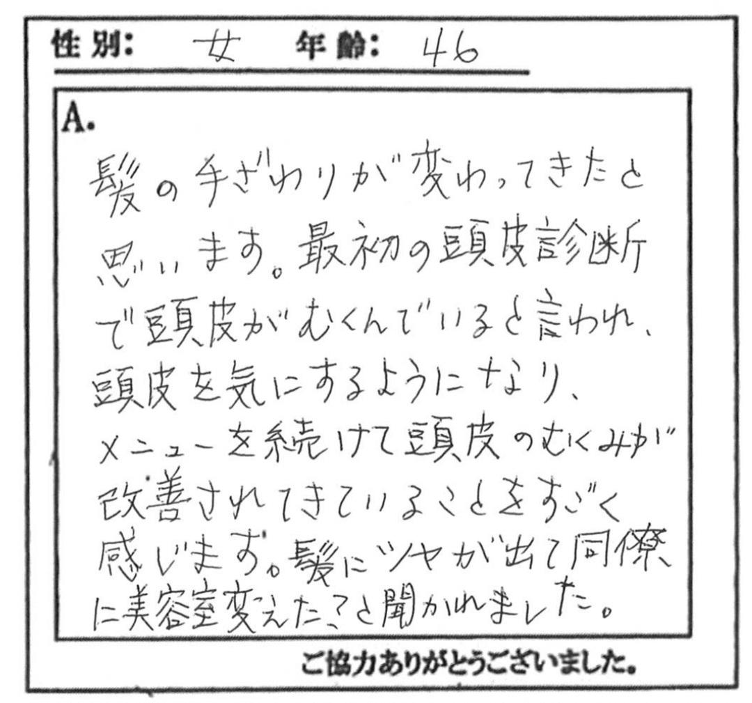 髪の手触りが変わってきたと思います。最初の頭皮診断で頭皮が浮腫んでいると言われ、頭皮を木にするようになり、メニューを続けて頭皮のむくみが改善されてきていることをすごく感じます。髪にツヤが出て同量に美容室変えた?と聞かれました。