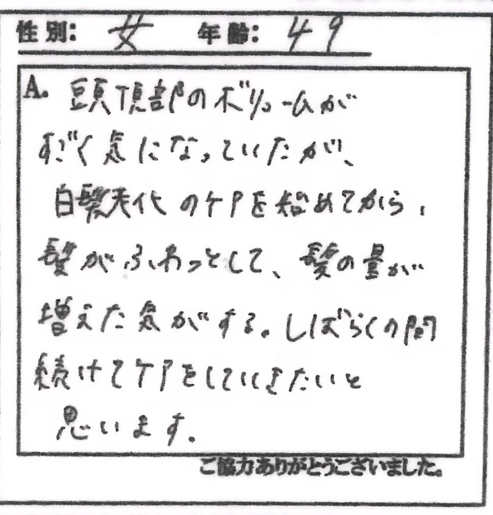 頭頂部のボリュームがすごく気になっていたが、白髪老化のケアを始めてから、髪がフワッとして髪の量が増えた気がする。しばらくの間続けてケアをしていきたいと思います。
