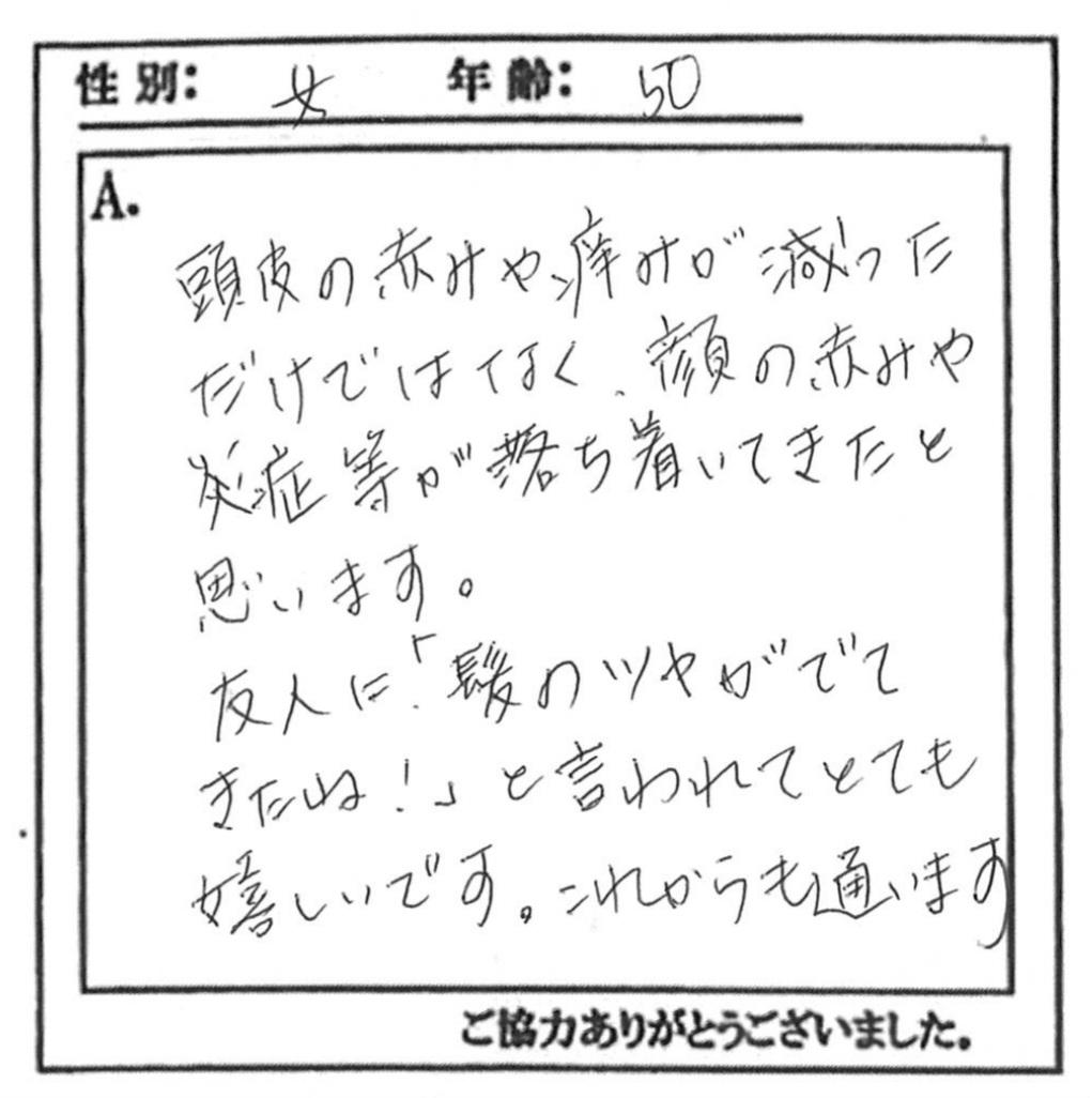 頭皮の赤みや痒みが減っただけではなく、顔の赤みや炎症などが落ち着いてきたと思います。友人に「髪のツヤが出てきたね!」と言われてとても嬉しいです。これからも通います。