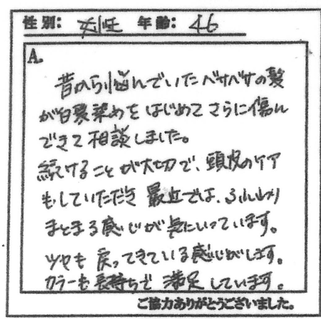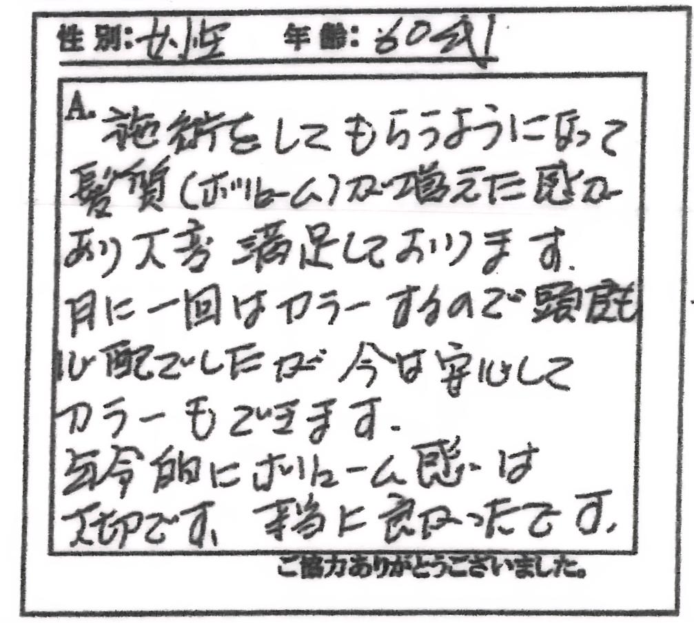 施術をしてもらようになって、髪質(ボリューム)が増えた感があり大変満足しております。月に1回はカラーするので頭皮も心配でしたが今は安心してカラーもできます。年齢的にボリューム感は大切です。本当によかったです。