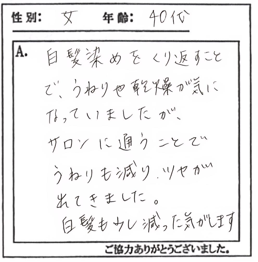 白髪染めを繰り返すことで、うねりや乾燥が気になっていましたが、サロンに通いことでうねりも減りツヤが出てきました。白髪も少し減った気がします。